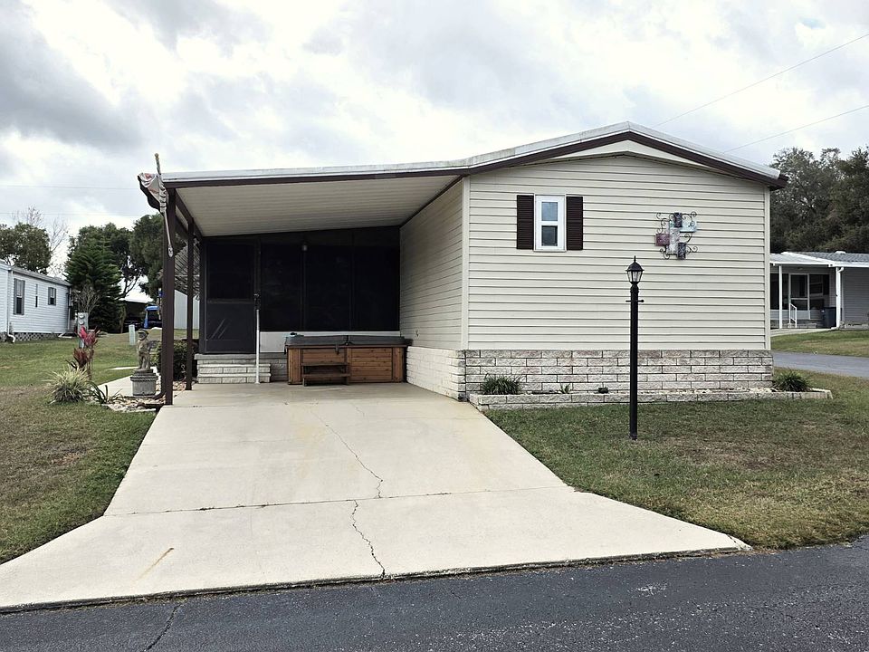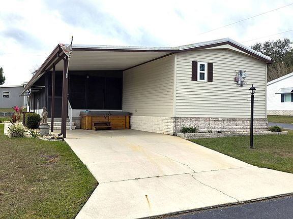 THIS HOME IS ON LEASED LAND WITH A MONTHLY LOT RENT OF $650 AND THAT INCLUDES SEWER AND GARBAGE PICK-UP *** LOOKING FOR A PERFECT HOME THAT IS COMING FURNISHED WITH LOTS OF UPDATES AND IS READY TO MOVE IN. HERE IT IS!!! THIS CHARMING HOME OFFERS 2 BEDROOMS/ 2 BATHS, MASSIVE FLORIDA ROOM, 2-PERSON HOT TUB, AND MUCH MORE. FISHERMANS COVE IS A GATED 55+ COMMUNITY LOCATED IS LOVELY DADE CITY. **** First look into the home is an AMAZING 12x21 Florida Room. Oversized and has vinyl windows, tile flooring, wonderful sea themed stained glass along the ceiling, lighted ceiling fan and the furniture is included. This will become your favorite room!!! **** LIVING ROOM 13x14 Good size Living Room with laminate flooring, lighted ceiling fan, and overlooks the Kitchen. **** KITCHEN Galley Kitchen with laminate flooring, nice looking cabinets, large double pantry, double sink and has a 2024 top-freezer refrigerator, 2024 coil-top stove and a counter-top Hamiliton Beach microwave. Off the Kitchen, is a 5x6 eat-in area with a round table and chairs. **** PRIMARY BEDROOM 10x13 Queen size bedroom with laminate flooring, lighted ceiling fan, walk-in closet and a large bright window. Bedroom will include a queen size bed, matching dressers and night stands. **** PRIMARY BATH In 2023, the Bath was remodeled with a new single sink vanity, medicine cabinets, light fixtures, tile flooring and an oversized step-in shower. Very easy to get in and out of. **** GUEST BEDROOM 10'5"x11'8" Full size bedroom with laminate flooring, wall closet and en suite to the Main Bath and comes with a full size bed and a dresser. **** MAIN BATH En suite to the Guest Bedroom and Laundry Room is a single sink vanity, medicine cabinet, laminate flooring, and a step-in shower. **** LAUNDRY Inside area that has more storage, and the washer/ dryer hook-ups are still available, even though they were moved to the Shed. **** SHED 10x12 This will make the perfect Man-Cave!!!! Large, bright with tons of storage, extra refrigerator, utility sink and holds the Whirlpool washer and dryer. Both can be moved into the home again. **** EXTERIOR Membrane Roof is 2022 *** All Windows have been Updated in 2022 *** 2-Person Hot Tub is included *** 1 Car Carport// 2 Car Driveway *** Enclosed 8x12 Breezeway that leads from the Florida Room to the Shed and outside to the Small Patio **** Corner Lot **** FISHERMENS COVE IS A LOVELY PARK LOCATED IN DADE CITY. LOT RENT INCLUDES SEWER AND GARBAGE. WATER AVERAGES ABOUT $15 A MONTH. THE PARK OFFER A HEATED POOL, CLUBHOUSE WITH UPDATED GYM AND A NEW FISHING PIER ONTO LAKE PASADENA. **** "All listing information is deemed reliable but not guaranteed and should be independently verified through personal inspection by appropriate professionals. American Mobile Home Sales of Tampa Bay Inc. cannot guarantee or warrant the accuracy of this information, measurements, or condition of this property. The buyer is responsible for all closing costs, sales tax, and title transfer fees. The buyer assumes full responsibility for obtaining all current rates of lot rent, fees, pass-on costs, lease agreement, rules, and regulations associated with the community, park, or home from the community/park manager. American Mobile Home Sales of Tampa Bay Inc. is not responsible for quoti