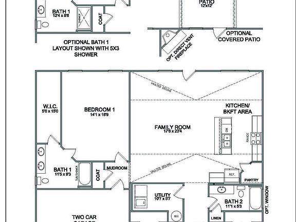 The Hampton Falls, part of the Trend Collection of floor plans, is an open layout ranch plan with three bedrooms, in a split bedroom style. The island kitchen offers both a dining area and countertop dining, and a storage pantry. A covered patio is at the rear of the home, just off the share living spaces. The primary bedroom suite at the front of the home includes a large walk-in closet, spacious bath with tub/shower and linen storage. Bedrooms two and three are located off a semi-private hall at the other side of the home, with access to the second bath. A full-sized utility room completes the home. Exterior details include a covered entry and layered gable roof.