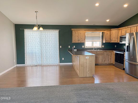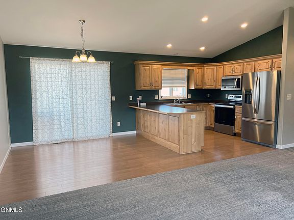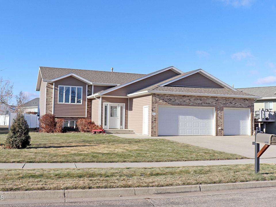 Come check out this move in ready home in Lakewood! Upon entering this split-level home you'll note the spacious entry way with a closet. The main level features an open dining, kitchen and living room with beautiful knotty alder cabinets and vaulted ceiling. The patio door off of the dining room brings in lots of natural light as you overlook the partially fenced yard (fences are not seller's property). The kitchen includes stainless steel appliances, peninsula island for additional seating with a walk-in pantry with custom shelving. The Primary suite has a 3/4 bath with a walk-in closet. The main level also includes another bedroom and a full bath. The basement features a family room with built in nooks and a gas, tiled fireplace. The lower level also includes two additional bedrooms, a full bath, a mechanical/laundry room and additional storage that's located under the steps. The 3-stall garage is heated with h/c water and a floor drain. Loft storage is also included in the garage for additional storage. Don't miss this wonderful opportunity to get into the Lakewood development in Mandan!