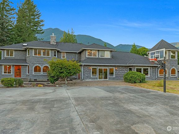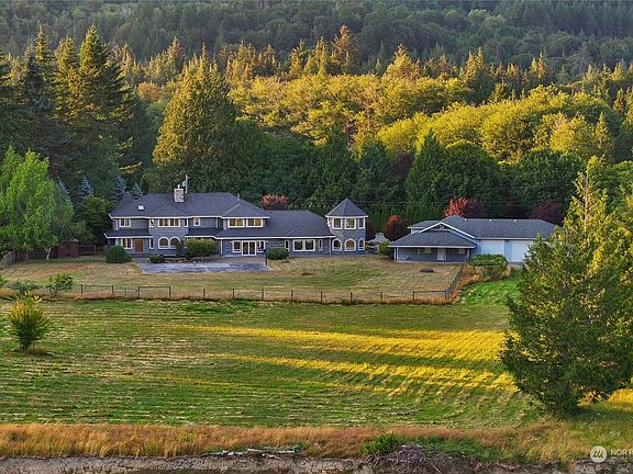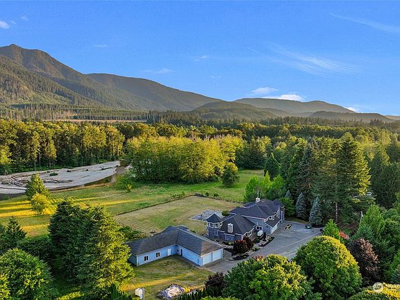 Experience the tranquility & beauty of the North Fork Stillaguamish River living in this exceptional home. Stunning riverfront house nestled on 5.6 acres of land offers the perfect blend of comfort & nature with a breathtaking view of the Cascade mountains. This property boasts a separate dwelling area for added versatility with an additional 3 bay garage good for an RV, hobbies, storage & enough total covered parking for 12 or more cars. Charm from this custom-built home w/ stone is complete with a turret that adds a touch of elegant whimsy. So many features to love, like an outdoor cedar steam sauna, gourmet kitchen w/ upgraded appliances, & expansive great room. Don't miss the chance to make this dream retreat your own!