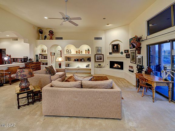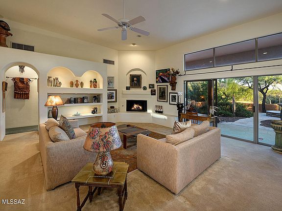 Enjoy fabulous entertaining and dining outdoors on the patio watching the incredibly vibrant sunrises & sunsets while immersing yourself in the beauty of the Sonoran Desert. Luxury living at its best with a resort style backyard showcasing a refreshing heated pool with water feature, gas fireplace, extended covered patio, flagstone and multiple outdoor seating areas all bordering a vast common area. This dramatic setting offers an inviting & relaxing atmosphere to entertain year round while enjoying the indoor/outdoor lifestyle so prevalent in Tucson.