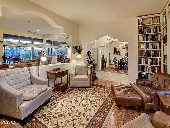 Welcome to Bellas Catalinas Estates - the prestigious gated foothills enclave of homes nestled on approximately 100 acres with gently rolling hills, arroyos, natural wildlife and lush Sonoran Desert vegetation. This custom single story home features four bedrooms & three bathrooms and offers Santa Catalina Mountain views as well as twinkling Tucson city light views - a quintessential Tucson estate home. As you enter through the front door, the welcoming foyer leads you to the living & dining areas that take full advantage of the mountain views. The living room is a perfect spot to curl up on the sofa with a good book while the dining room offers striking mountain views when you are enjoying your morning cappuccino. The open concept kitchen has a gas cooktop, double ovens, breakfast bar, double sink, huge pantry and a breakfast nook that overlooks the lush tranquil garden. The great room - with a gas fireplace, custom niches and sliding doors with access to the garden & pool - opens to the kitchen providing an open floor plan concept which is the perfect gathering space for family & friends. The primary suite offers dual vanities, walk-in shower, jetted tub, two closets (with one being a large walk-in) & a door which leads to the private backyard patio. Split bedroom floorplan. Bedroom 2 - which could easily be a home office, offers beautiful built-in bookcases, lighted ceiling fan, large walk-in closet, exterior access and great mountain views.