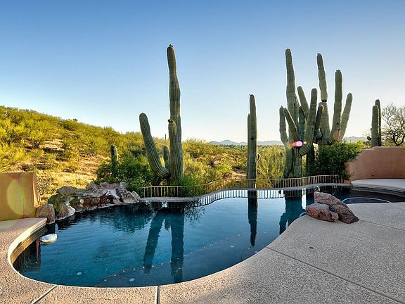 Sited on .99 acre, this serene sanctuary maintains a sense of seclusion in the lush Sonoran desert offering native vegetation including Saguaro cacti, shady mesquite trees, orange flowering ocotillo, flowering lantana, agave, as well as Texas Ranger with its vibrant purple flowers. Many, many upgrades including Energy Star designated home, oversized three car garage, separate laundry room with sink & plenty of cabinets, skylights, lighted ceiling fans, wrought iron security doors, front & rear water fountains, drip irrigation system and storage galore. Two zoned HVAC units. Close to the bike loop, great hiking, world class golf, resorts and fine dining. A true oasis in the Sonoran Desert.