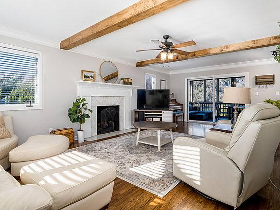 The modern farmhouse kitchen was completely renovated to include quartz countertops, a large farm sink, new KraftMaid cabinets with under cabinet lighting, Thor gas range/oven, KitchenAid trash compactor, and specialty drawers and cabinet pull-outs throughout. Gorgeous wood beams span the ceiling in the large, open living space that flows effortlessly into the dining area, kitchen, and through the sliding doors to one of three spacious decks. Book lovers will feel right at home in the cozy study complete with stone fireplace and floor-to-ceiling bookcases with sliding ladder. Plenty of space to grow your personal library!