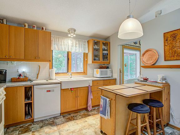 Great twin home on quiet cul-de-sac feels like single family.No association fee. 3 bedrooms on one level. Large linen closet in hallway. Main bedroom with walk in closet has walkthru to bath. Both upstairs and downstairs baths have been updated. Kitchen has been updated and redesigned with Ikea, has farmhouse sink and informal eating area. Cozy fireplace in living room. Newer flooring. Solar tubes in vaulted ceilings let in the natural light. A wonderful screened porch off the dining room is absolutelu charming. Private back yard with many mature trees and plantings; feels like you are in the country! Lower level has a family room, 3/4 bath and plenty of storage space. Spacious oversized 2-car garage. Very well maintained. Close to walking paths, parks, Williston Fitness Center and Minnetonka Farmers market.