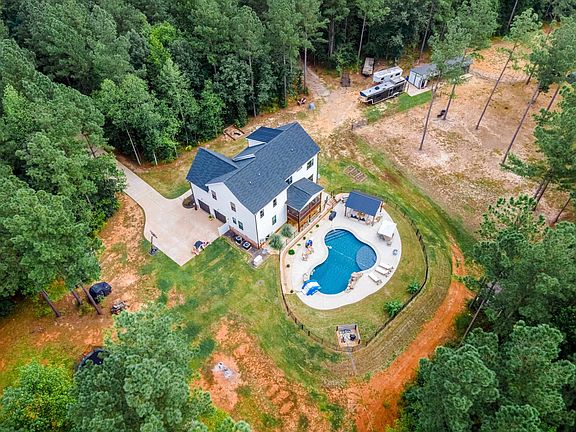 Your private oasis awaits. Only minutes from the Flowers area of Clayton with shopping and restaurants. Beautiful custom built home located a half mile down a gravel road will give you the peace and quiet you're looking for. Hardwoods throughout and gorgeous reclaimed wood accents this home perfectly. Bedroom with it's own bathroom located on the main floor, along with the primary and additional bedrooms up. Dog washing station in the laundry room and beautiful barn doors throughout the home. Bonus room can also be used as a bedroom equipped with ample closets. The beautiful in-ground saltwater pool (complete with covered pergola) is the perfect way to beat the hot summer days. A shedrow horse barn complete with 3 12x12 stalls and tack room with a pasture is perfect to start your own farm. 500 gallon underground propane tank fuels the tankless water heater, range and whole house Generac generator.