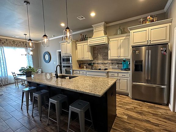 This beautiful home sits in the quiet neighborhood of Longhorn Estates in the desirable Chisholm school district! This gorgeous home offers four bedrooms, two bathrooms, and a beautiful backyard to entertain in! Cool off this summer in the swimming pool and enjoy a drink from the outdoor kitchen! Pets are welcome! This home also has an invisible fence so your pets can play and you can enjoy your view! The third car garage offers a storm shelter, along with collapsible folding benches that makes for the perfect workshop! The inside of this home is truly stunning with wood tile flooring and cool gray tones. The kitchen is sure to catch everyone's attention with stainless steel appliances, white cabinetry, and granite countertops! This home offers so many extras, you will have to come see it for yourself!