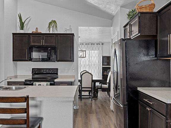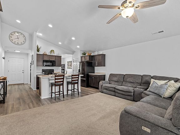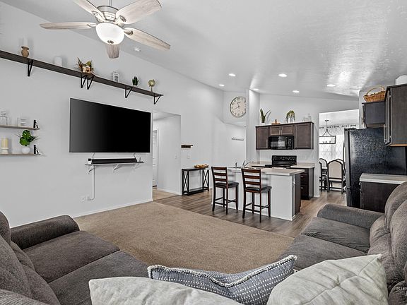 Welcome home! This charming and functional single-level residence is designed for modern living, nestled in an established neighborhood with 10 acres of open space, scenic walking paths, and a private park. Inside, the open-concept layout with vaulted ceilings creates a bright and inviting atmosphere, perfect for entertaining. The stylish kitchen features an island with bar seating, seamlessly connecting to the great room—ideal for casual meals and gatherings. A thoughtful split-bedroom floor plan provides both privacy and flexibility to suit your lifestyle. Step outside to a spacious backyard with an oversized patio, perfect for relaxing or hosting guests. Conveniently located near top-rated schools like Ronald Reagan Elementary and East Valley Middle School, as well as parks and the Nampa greenbelt. This home truly offers the perfect blend of comfort and community!