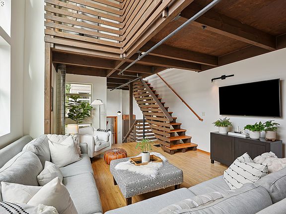 Stunning industrial-style home in desirable Richmond! Open floor plan w/ tall ceilings, exposed beams, & hardwood floors. Large windows bring in tons of natural light! Functional kitchen offers stainless steel appliances, floating shelves & plenty storage w/ access to balcony. 2 spacious bedrooms on upper level, including primary ensuite w/ walk-in closet and bedroom on main. Fully fenced backyard including IPE decking & plenty of privacy. A unique blend of industrial chic and modern comfort!