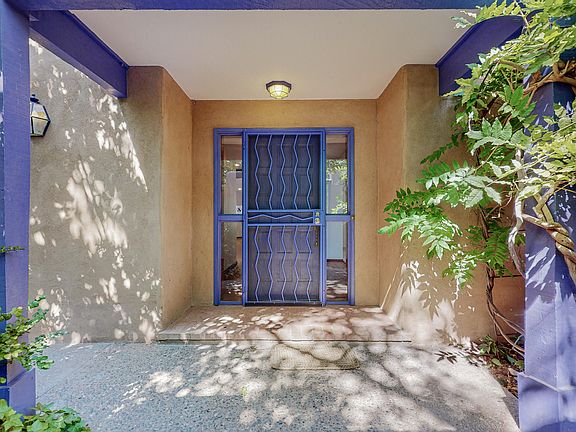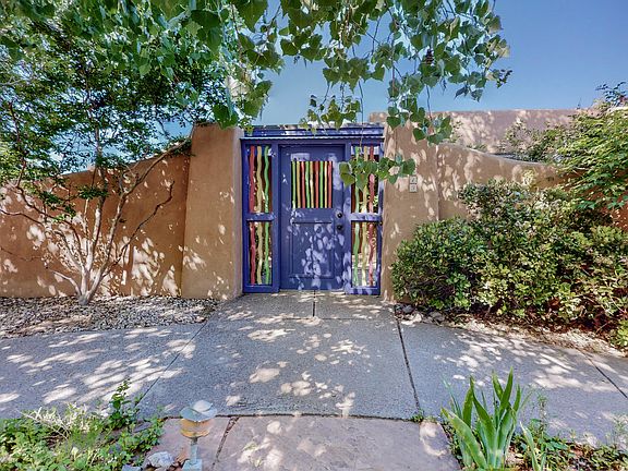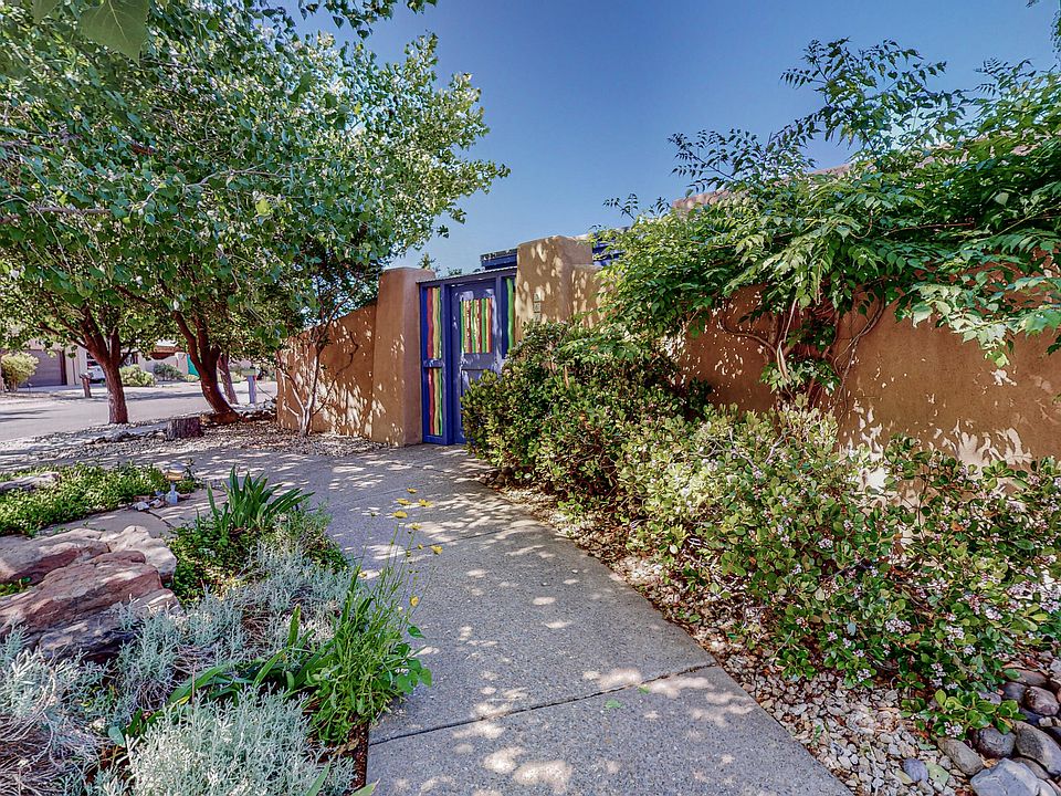 Welcome home to the beautiful North Valley of Albuquerque. Sited on a small cul-de-sac off of Rio Grande Blvd., you will enter the private, landscaped courtyard to the front door of this beautiful Pueblo-style home. Features 2 primary bedroom suites with bathrooms and garden access, an additional room for bedroom or home office, large, bright living room with a wall of windows and built-in bookcases, designated dining area, a separate large and open kitchen and family room complete with back garden access, brick floors and fireplace. Enjoy beautiful vistas of the courtyards and private landscaped back garden complete with a flowing pond. Front garden features flowers and fruit trees. Convenient location near Flying Star and El Patio, Bookworks, bosque hiking trails and Nature Center.