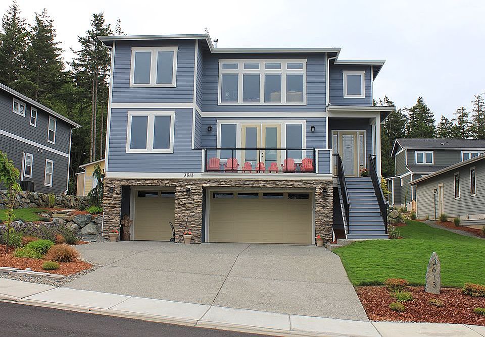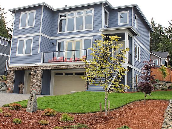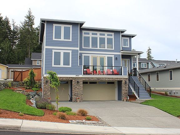 Spectacular water and island views from this amazing multi level home! Upgrades include beautiful hardwood floors, crown molding, window/door trim, coffered ceiling in dining room and French doors to both the front balcony and backyard oasis. Open concept living room, kitchen & dining. Enjoy the cozy fireplace surrounded by built in shelving. The large kitchen island is perfect for gatherings & includes granite countertops, walk in pantry & stainless appliances. Master bedroom boasts huge walk in closet, soaking tub, separate shower and double sink vanity in master bath. Fully fenced, level backyard with stone paved fire pit area and garden. Oversized three car garage leaves room to build a shop or at home gym.