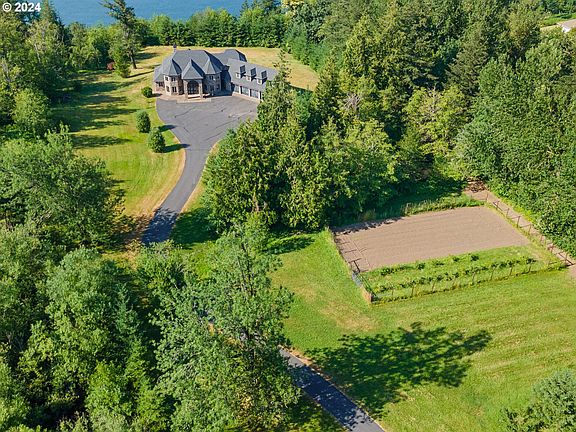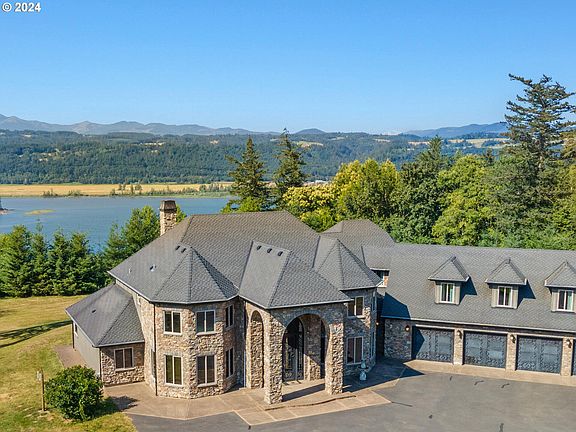 Welcome to the Castle in Corbett located in the Columbia River Gorge National Scenic Area! Gorgeous river and Mt. Adams views from this spectacular estate on over 7 acres. Incredible 2 story entryway with circular staircase greets you with views from every window. Gourmet kitchen has two islands with Jerusalem limestone rough edge countertops, copper farm sinks, 4 dishwashers, custom cabinetry, 6 burner gas range, with two convection ovens, Dacor appliances, built-in refrigerator, pantry and pull-out drawers. 2 story living room with stone fireplace, crown molding, new Berber style carpeting. Cantera handcrafted wrought iron doors. Custom lighting fixtures in each room. Arched entryways, hand-scraped hickory floors. Dual Primary Suites, both on the main floor. One with custom cabinetry closet w/ built-in lighting, marble island of drawers, marble vanity, heated travertine tile floors, antique clawfoot tub, 6 shower head tile steam shower. Solid knotty alder doors, built-ins in nearly every room, Hunter Douglas blinds. Incredible bonus room over 4-car extra large garage, media room w/ surround-sound, wet bar and balcony. Room for pool or tennis/pickleball court! Mature apple, pear, cherry tree orchard, blueberries, pond, creek, and spacious fenced garden. Whole house (propane) generator, 4 zone heating, recirculating hot water heaters, fiber optic internet and cat-5 wiring. Private and secluded borders 11 acres of USFS yet, only 20 minutes from the airport.