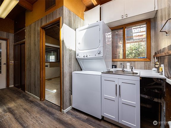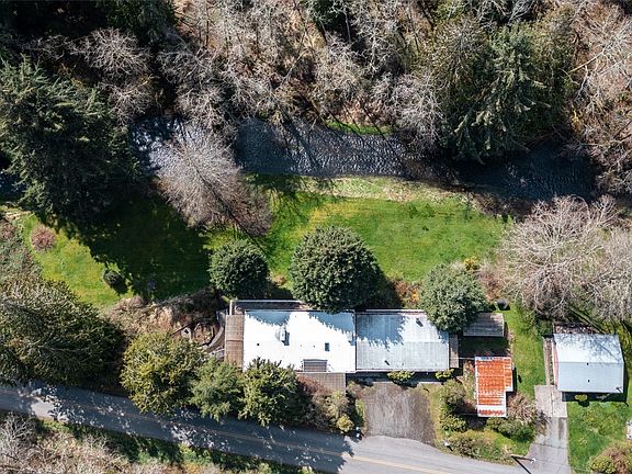 Bring your cash investors & creativity to this beautiful, private 4.7 acre waterfront lot on Friday Creek with a mid-century modern home. The residence boasts floor-to-ceiling brick fireplaces, open beam vaulted ceilings, 2 bedrooms, 2 additional rooms w/closets, wraparound deck, and extensive beautiful nature & creek views. Paved carport, Covered RV/ boat parking, heated shop/garage, 220 outlet and generator. Great area to Entertain, garden, or relax while a 2 bed 1 bath rental generates $1300/mo. Firm lush lawns provide privacy for each home, while mature woods across the 700+ft of creekfront protect property from future development. Home is not in the flood plain! There is not a more desirable lot on Friday Creek.