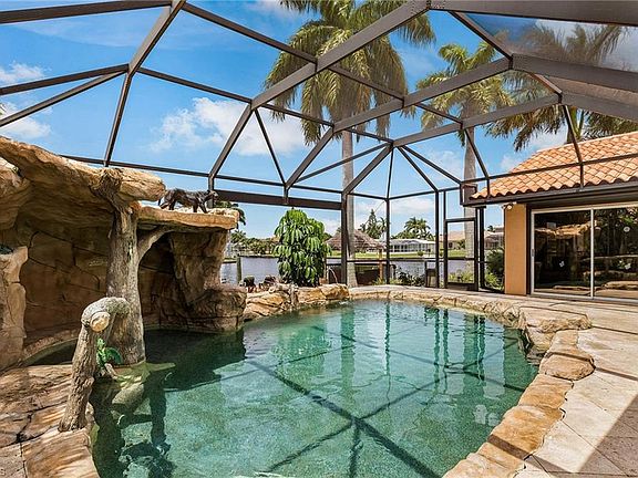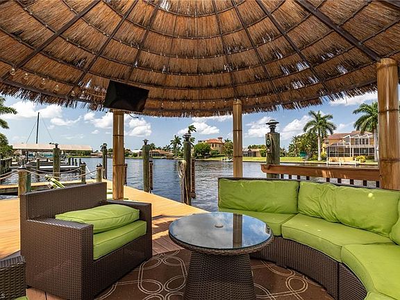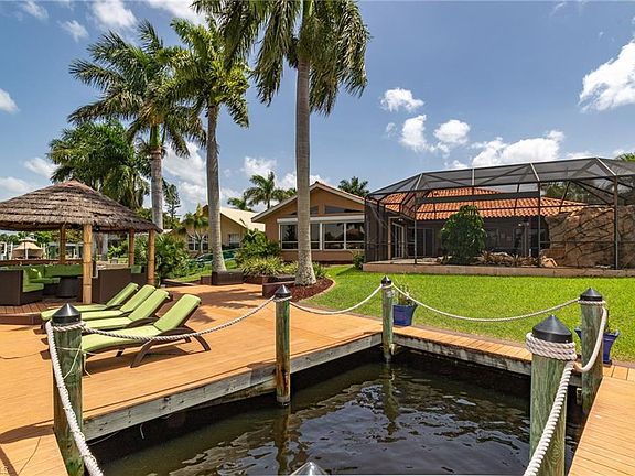 Welcome to your waterfront paradise! Enjoy the glorious SW Fl sunsets from your spacious waterside TIKI HUT overlooking intersecting 250' sat water canals just one turn ( no bridges!! ) off the Caloosahatchee river and the Gulf of Mexico or laze in your tropically themed pool with its hot tub grotto and waterfall! The screened lanai area also includes a spacious covered area with room for both conversation seating and dining and a convenient poolside bath. This elegant home is being offered turnkey so it could become a seasonal rental immediately. It's interior appointments include a chef's delight kitchen with granite counters, large entertaining bar and lots of storage, a light and open family room complete with fireplace and water views and a formal dining area. The master suite offers privacy and more water views, a soaking tub and a huge closet. Feel free to bring your yacht as there is space for up to 60' with 50 amp service. For convenience its nestled in the riverfront Savona neighborhood that's located close to all of SE Cape Coral's many dining and recreational opportunities and the Cape's beach at the Yacht Cub.