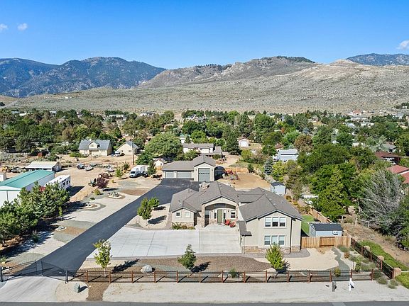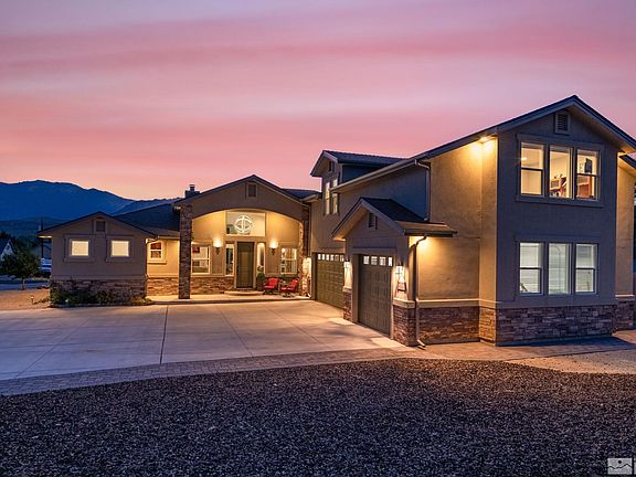 Luxurious property on 1.17 acres with large detatched 3-car double deep garage and 20’ x 45’ RV storage garage. Beautiful grand entry of this open floor plan, you'll have wonderful views of the Sierras. High ceilings and excellently done kitchen with elegant features and views to die for. In floor hydronic heating throughout. First floor master suite with beautiful freestanding, jetted soaking tub, walk-in shower, even more views of the Sierra's. Even a dog wash. Call us today!!!, Nestled in Carson Valley just south of the state's capital, off US 395, you'll discover a remarkable property waiting to become your home. Boasting 2,573 square feet of living space on 1.17 acres. Impeccable landscaping, supported by a fully automated drip and sprinkler system, stretches from end to end. A large deck with a power sunshade and a built-in jacuzzi tub offers a perfect vantage point for watching the sun set behind the Sierra Mountains. A natural gas-fed outdoor kitchen with a skillet, smoker/BBQ rotisserie, briquette grill, and sink enhances your outdoor entertainment options. A fully enclosed dog run with artificial turf and a powered, insulated workshop complete with heating, cooling, and a functional sink are situated by the attached garage. At the rear of the property, a detached 3-car double-deep garage and a 20' x 45' RV storage garage are fully insulated, featuring forced air AC, a 50-amp breaker, and a water hookup. The RV garage includes a full air compressor system, a rear roll-up door for pass-through access, and a restroom. Upon entering the home, your eyes are drawn to a wall of west-facing windows that frame the Sierra mountains. The main living room features high ceilings, an oversized ceiling fan, built-in surround sound, and top-down/bottom-up shades throughout the house. A floor-to-ceiling wood-burning high-efficiency fireplace serves as the room's centerpiece. The expertly equipped kitchen, designed around three hand-blown glass light fixtures, invites you to cook and entertain in style. A spacious island with bar seating and a deep stainless-steel sink with instant hot water make meal preparation a breeze. A pot filler is positioned above the 5-burner stainless steel gas cooktop, while soft-close cabinetry and a generous walk-in pantry provide ample storage for hosting gatherings. On the ground floor, the master bedroom suite offers large windows along the west wall, providing breathtaking views of the Sierra Mountain range. An exterior door leads to the backyard porch, ensuring a seamless transition from the jacuzzi tub to the master bathroom, which boasts a light therapy freestanding tub and a spacious walk-in steam shower with dual wall-mounted showerheads and a ceiling-mounted waterfall head. Dual walk-in closets and dual sinks offer convenience for morning routines. Heading upstairs, you'll find a full living area with a ¾ bathroom featuring a stand-up shower and a versatile room that can serve as an office, bedroom, or guest room. Safety stair lights integrated into the stairway automatically illuminate in the evenings. The upstairs lounge includes a built-in wall safe, wine rack, mini-fridge, two ceiling fans, and its own AC temperature zone. Back on the main floor, just beyond the stairway, a well-equipped laundry room boasts matching cabinets found throughout the home and a convenient at-home dog wash basin located next to the garage entry. The attached 3-car garage is double deep, fully finished, insulated, and heated, with an epoxy-coated floor. The entire home features in-floor hydronic heating, dual-zone AC, a centralized data hub with full media and sound capability, whole-house security cameras, granite countertops, exquisite furnishings, up/down fabric blinds, recessed lighting, and multiple ceiling fans.