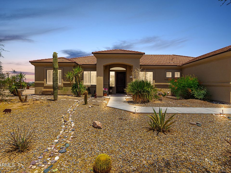 Welcome to your dream home! This stunning 4 bed, 2.5 bath custom home offers 2,639 sqft of beautifully designed living space on 1.57 acres with breathtaking mountain views. No HOA! Perfect for horse lovers & outdoor enthusiasts a short distance to the San Tan Mt Regional Park. This property is fenced with plenty of space to build your dream workshop, store toys or create your ideal retreat. Step inside to soaring 10-ft ceilings, 8-foot doors & rich plantation shutters throughout. The expansive open kitchen is a chef's delight, featuring oversized knotty birch cabinetry, granite countertops, SS appliances & a large island perfect for entertaining. The highly upgraded primary suite boasts a luxurious bath with travertine surrounds, a snail shower & an oversized soaking tub. The 4-car garage offers ample room for vehicles & storage. Relax in the block-walled backyard, a park-like setting featuring a beautiful paver patio, a pavilion, and a children's play area. You will love this place. Enjoy privacy, views & space surrounded by mature trees, lush landscaping & even a fruit tree orchard. Don't miss this one of a kind opportunity to own a private slice of paradise & enjoy country living with city convenience. Just minutes away from the heart of Queen Creek. See list of Highlights of the Home in Document Tab.