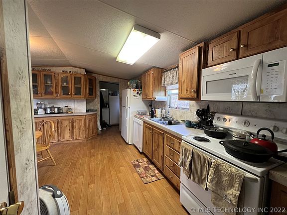 2006 singlewide 16 x 76 mobile home sits on 5 acres m/l. 3 bedrooms, 2 bathrooms, pantry, new dishwasher, new microwave vent hood. Property has well water with water softener and 2 septics. RV hookup Older home on property is used for storage, barn, cellar, chicken coop, small animal pen. Fenced on 3 sides and cross fenced. Property surrounded by 300 acres of State land. Property has an interesting old rock barn foundation built in the ground. Property to be sold as-is. Just .3 mile East off Hwy 99 North of Hallett. Easy access to Hwy 412 for a neutral commute to Tulsa or Stillwater. Close to Hallett Raceway