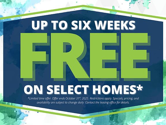 - Special offer! Up to Six Weeks Free on Select Homes! *Limited time offer. Offer ends October 31st, 2025. Restrictions apply. Specials, pricing, and availability are subject to change daily. Contact the leasing office for details.