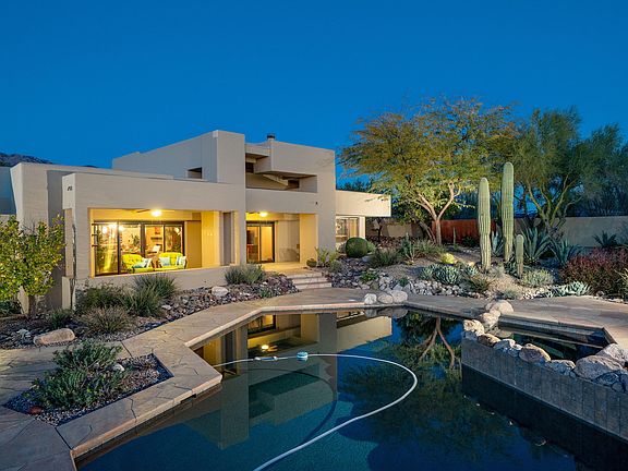 Stunning Tyson Murphy nestled on nearly an acre in the Catalina Foothills features expansive patios for mountain, city and sunset views. The architectural features create a comfortable environment with character - timeless! Well placed windows and skylights afford the right amount of light. Split floorplan with huge master suite and adjacent office with additioal bedrooms and guest quarters (private patio, entrance and bath). You'll want to see this one!