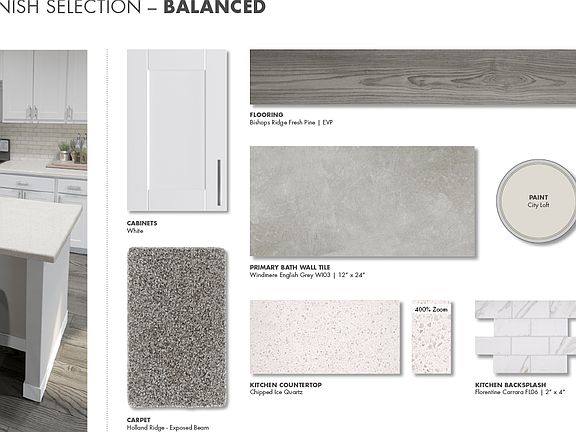 A walk-in pantry and large kitchen island make it easy to feed a group. Tray ceilings in the primary suite lend an elegant touch. White cabinets with chipped ice quartz countertops, EVP flooring with dark gray tweed carpet come in our Balanced package.