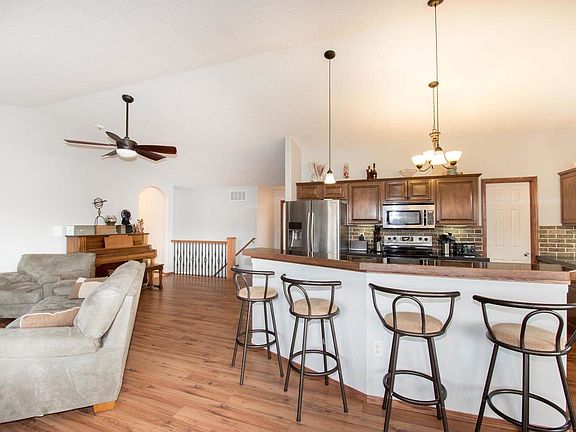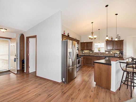Price reduced! Stop by and take a look inside! Not your typical layout/floor plan. Built in 2007, split bedroom floorplan with vaulted ceiling and wood laminate floors throughout the main floor living space. New carpet on main floor hallways and bedrooms. Open kitchen design with oversized eating bar, new granite counter tops, stainless steel appliances and walk in pantry. Master bathroom offers dual vanity sinks, soaker tub, separate shower, and walk in closet. Full-finished view out basement, wet bar and storage area. Covered deck, irrigation well, sprinkler system, wood privacy fence, patio area with fire pit and nicely landscaped yard. Maize South Schools and LOW specials remaining. Located 1 block from community playground and swimming pool.