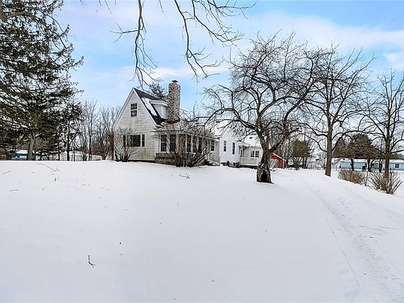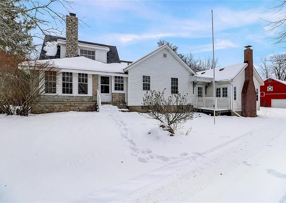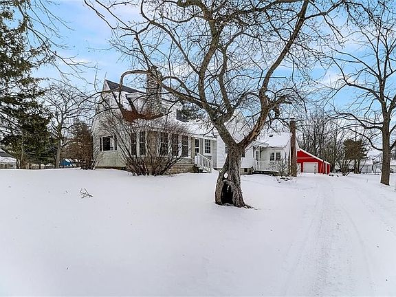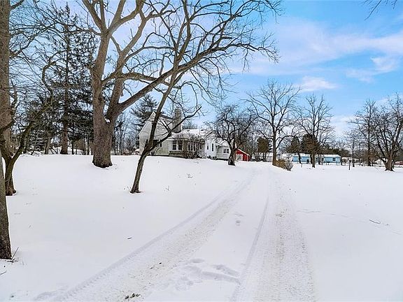 Location, Location, Location! This is the perfect mini farm nestled at the edge of town on 2.21 acres. Property has oversized garage and original barn with new siding and roofs. Storage barn and chicken coop add to the charm. White country house has large picture window with beautiful view of the property. Spacious eat in kitchen with stainless refrigerator, dishwasher, microwave and gas range. Great sight lines for entertaining and tons of counter space for cooking. Half bath, family room and living room both with fireplaces. Spacious master bedroom with full hall bath, conviently located laundry room. Enclosed front porch perfect for relaxing evenings. Side door has deck perfect for grilling out. Peaceful surroundings await!