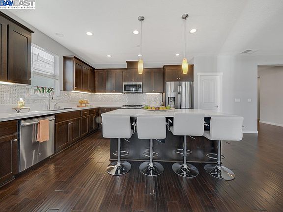 Welcome to this beautiful west facing single-level home, which is just 5 years old. As you step inside, you'll notice the beautiful hardwood floors throughout the main living areas, while the bedrooms are adorned with cozy carpeting and the bathrooms boast elegant tile. This residence offers 4 bedrooms, 2.5 baths, and a dedicated home office space.The highlight of the home is the open concept design that seamlessly connects the large family room and kitchen, creating the perfect setting for entertaining guests. The kitchen itself is a chef's dream, featuring sleek quartz countertops, a stunning contemporary upgraded backsplash, and a convenient walk-in pantry. The master bedroom is incredibly spacious, with a generously sized walk-in closet and an ensuite bathroom that includes a double sink vanity, an oversized shower area, and abundant natural light streaming in. Step outside to the backyard, where you'll find a fabulous upgrade with pavers and an outdoor kitchen complete with a built-in BBQ and a refrigerator. This outdoor space is ideal for hosting summer gatherings and enjoying the outdoors. The location of this home is incredibly convenient, situated within walking distance to major supermarkets, restaurants, and community parks.