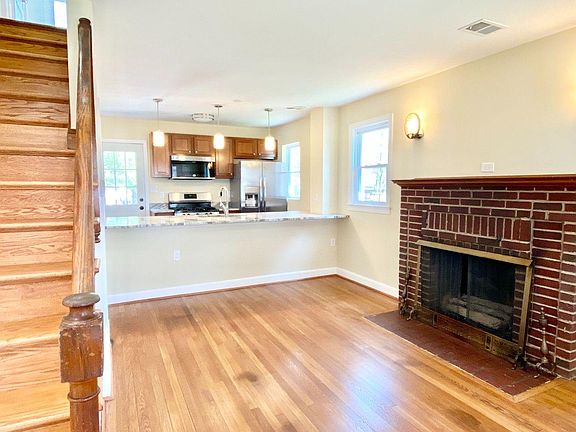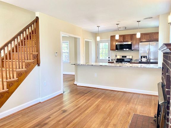 The kitchen has stainless steel appliances, granite counters and opens to the living room. The living room is spacious with a decorative fireplace.