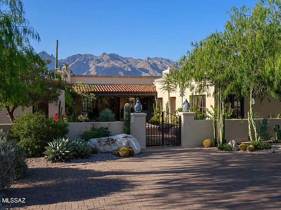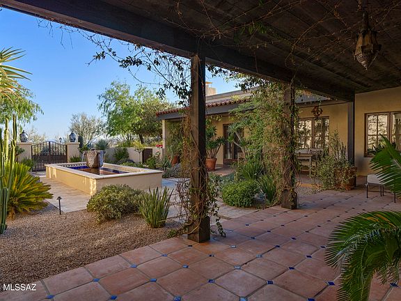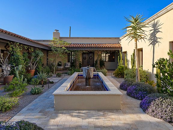 Gracefully positioned at the terminus of a quiet cul-de-sac within the distinguished, guard-gated community of Catalina Foothills 10, this private residence rests atop a 1.9-acre hilltop, commanding unobstructed vistas of the Catalina Mountains by day and a tapestry of city lights by night. Rooted in the regional architectural vernacular and inspired by the enduring soul of San Miguel de Allende, the home reflects a studied balance of old-world romance and regional expression. Approached by a gently winding paver drive, the home reveals itself through a formal motor court that opens onto an enchanting entry courtyard, centered by a tiered fountain and framed by an outdoor fireplace. The architecture unfolds in a classic central courtyard configuration, allowing nearly every principal room to engage with the outdoors through deep, shaded portals and view-framing arcades.