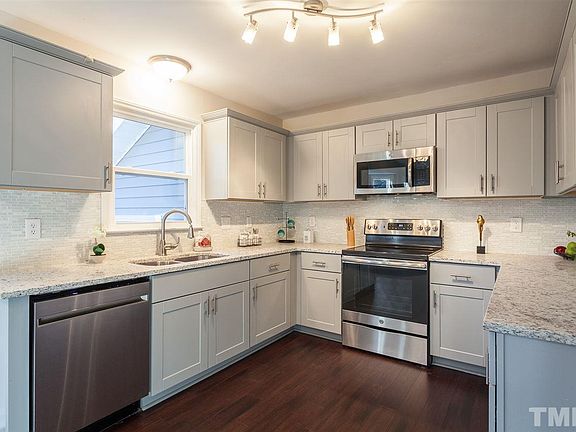 GORGEOUS with a bright open floor plan and upgrades galore! Includes a new custom designer kitchen with shaker cabinets, granite, glass tile backsplash and Stainless Steel appliances. EXOTIC 5 inch Bamboo hand scraped hardwood flooring; NEW plush carpet & designer paint. Great flat back yard. Finish bonus on 3rd floor. New vinyl, roof and windows 2019. Convenient to 540, 440 and Triangle Town Center. Move in and enjoy!