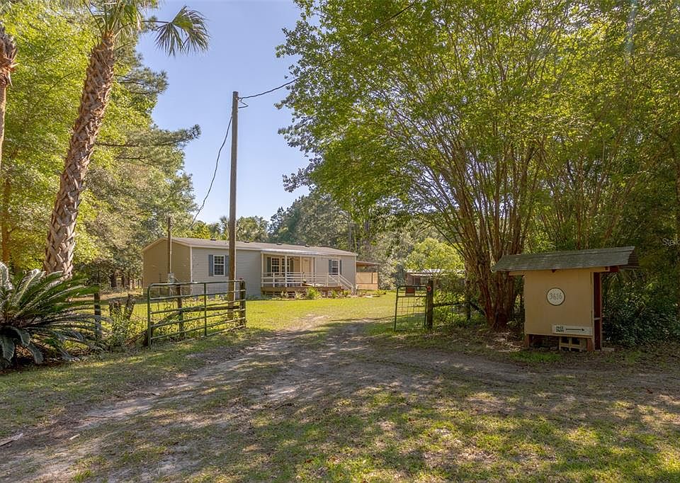 Nestled within the serene embrace of a burgeoning rural landscape lies this exquisite gem: a contemporary double wide mobile home with 3 bedrooms, and 2 baths set upon 10 expansive acres of picturesque countryside. As you approach, a winding driveway bordered by lush greenery welcomes you, hinting at the tranquility that awaits within. The mobile home itself exudes modern elegance, boasting clean lines and tasteful finishes that seamlessly blend with the natural surroundings. A spacious front porch beckons you to pause and savor the panoramic views of rolling hills and verdant meadows stretching as far as the eye can see. Step inside, and you're greeted by an inviting interior flooded with natural light. The open-concept living space offers a harmonious fusion of comfort and style, featuring luxury vinyl flooring and lots of decorative touches throughout. Retreat to the private quarters, where tranquility reigns supreme. The master suite is a haven of relaxation, boasting a spa-like ensuite bath and a walk-in closet, providing a sanctuary to unwind after a day spent exploring the great outdoors. Located in a growing rural area, yet just a short distance from city of vibrant communities (such as city of Newberry and Alachua) and urban amenities (Publix shopping center with restaurants and local businesses), this home offers the best of both worlds - a peaceful retreat with easy access to conveniences and opportunities for growth. Don't miss your chance to experience the epitome of modern country living in this idyllic setting.