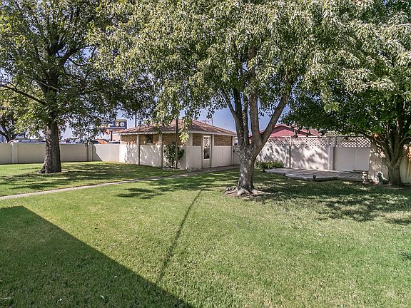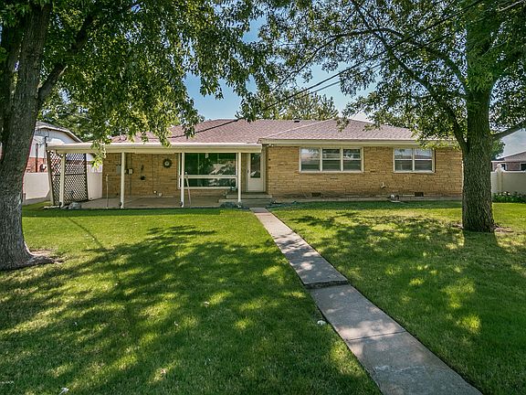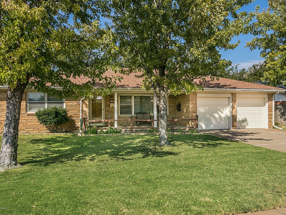 Charming Curb Appeal on this Corner Lot South Wolflin House. Covered Front Porch perfect for sitting on a fall evening and Large Covered Patio. Lots of natural light from this home's great windows. 3 Bedrooms, one with atrium doors that could make a great den, 2 baths, 2 garage. Living room, kitchen and dining are open. Home has exterior 2 room office/man cave/she shed that's heated and cooled. A new roof is coming! Great House, Ready for your Cosmetic Updates!