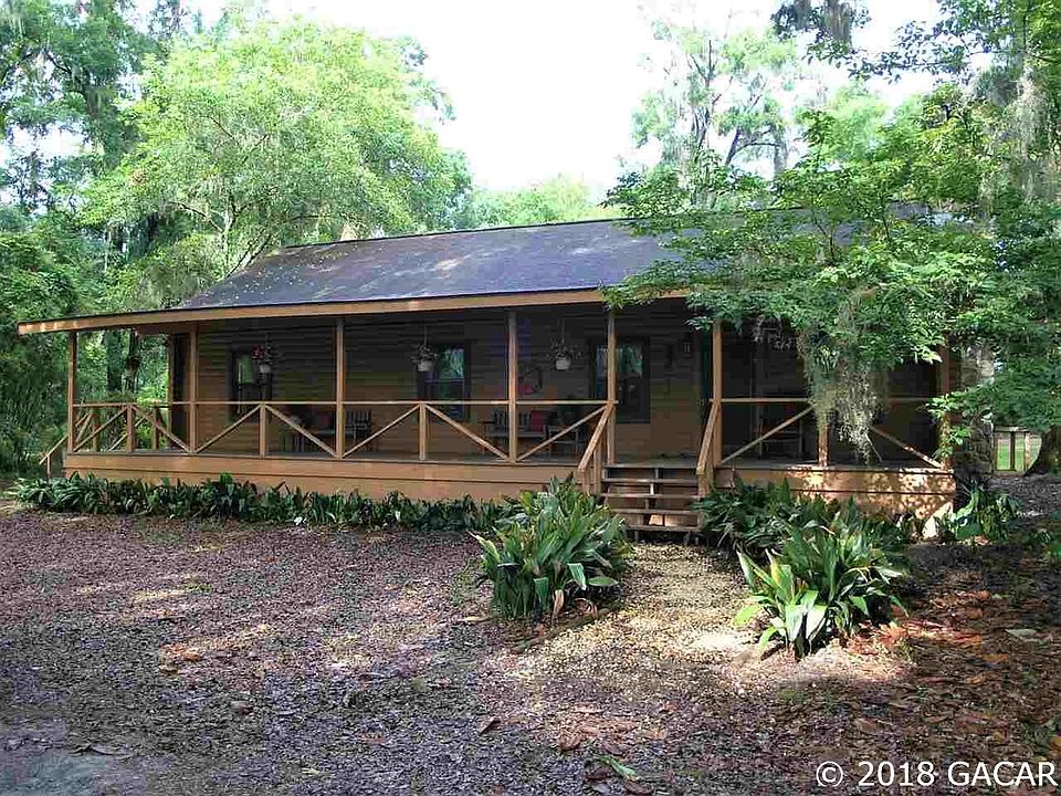 Tranquil and romantic setting on 5 acres just minutes from Jonesville / West Gainesville. This adorable and immaculate log home has been loved by only 2 owners. It is set back in a hammock of picturesque granddaddy oaks adorned with Spanish moss. About 40% of the parcel is wooded and 60% open pasture. It is fully fenced and gated. There is also a chicken coop and 2 livestock pens. The huge front porch and gorgeous screened rear porch beckon you to relax in a rocker or the bench swing while sipping a cold sweet tea. Step inside to the large vaulted ceiling great room with wood burning stove. The kitchen opens to the great room and is a fine example of country comfort and elegance with wood cabinetry, 42 inch uppers, granite counters, stainless steel appliances and gas stove. There are 3 bedrooms, 2 baths and a nice size laundry room with washer and dryer included! Outbuildings include a huge 720 sqft metal building with roll up door on slab, a small greenhouse and a pump house / storage building. This is a special home and setting not to be missed!