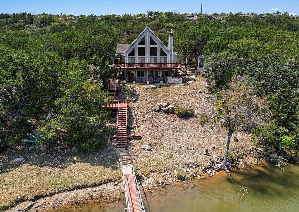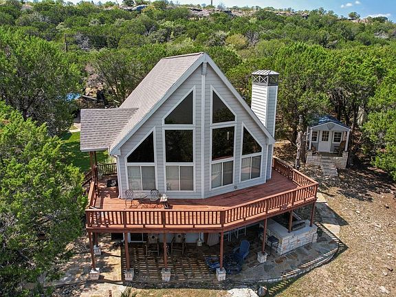 Stunning 3-story A-frame lakefront home on Possum Kingdom Lake. 3 bedroom 2 bath home with extra living or game room downstairs. Home comes mostly furnished. Kitchen features quartz counter tops and custom cabinets, flowing into a cozy living room with a wood burning fireplace. Master bedroom is a loft with windows to the top of the cathedral ceiling to watch the sunrise come up over the lake. Covered porch on first floor with outdoor kitchen area and deck on second floor both offering an amazing view of the lake! Concrete driveway for ample parking and 2 car carport with storage. The cutest casita to read or watch tv in and enjoy the lake. Mancave workshop built in the last couple years. There is no HOA and the 1+ acre is owned not leased offering 150 feet of shoreline. Dock with boat lift and 2nd story party deck. Water Level is typically around 9 feet deep. Two 1550 gallon water tanks to be able to keep plenty of water with a heater cord wrapped around the pipes that turn on when temperature drops below 45 degrees to prevent freezing pipes. Extra shed for even more storage. Beautiful rock work outside. With breathtaking lake views, and endless space to relax or entertain, this property truly has it all!