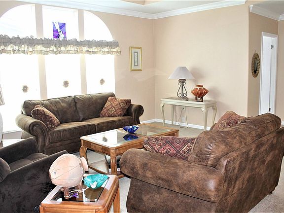 This unique 2 BR 2 BA, furnished home is ready for you to move in. this home is located on a spacious corner lot and has everything you need, including dishes and pots and pans. new appliances, refrigerator, dishwasher and garbage disposal in 2019. Roof replaced in 2016, side patio added in 2019. This home has been freshly painted, has an open concept, neutral carpeting in the living room and bedrooms, bathrooms have raised vanities, walk in closets in each bedroom, a spacious Florida room with