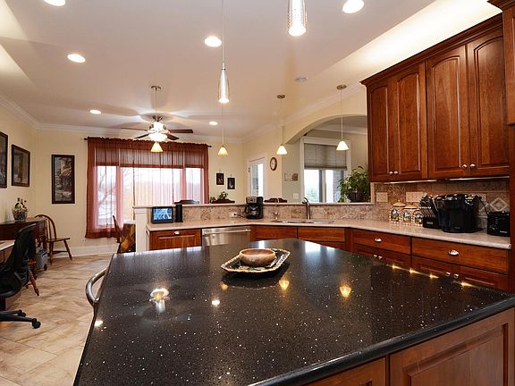 Outstanding craftsmanship EVERYWHERE! Custom split floor plan. Owner's suite in the North wing of home, beds 2,3,4 in the South. This home feels rich and unpretentiously luxurious. Quality is apparent. Solid 3" oak hardwood floors, 7 1/4" trim throughout, 3 1/2" inch window casings, dining room wainscoting, crown molding. The restful owner's suite features tray ceiling, spa-like bath & waterfall shower, back lit LED anti-fog mirror, custom closet. Bedroom 2 has private bath, beds 3 & 4 have jack and jill with separate sinks and toilets and shared shower. Quartz kitchen, double oven, custom cabinetry, wine cooler, pot filler faucet near 6 burner cooktop w/ grill, island, pantry. 2 fireplaces. One gas, one wood burning. Walkout unfinished basement is wide open and ready. Bath rough-in and radiant heat hook-up. The diamond in the rough, not to be missed is on the 2nd flr of this Ranch home. 4,700 sq ft of unfinished attic space (accessible by the 4 ft wide carpeted staircase) is unbelievable! 14 ft ceilings. The added space keeps going in this home. Over-the-garage workshop/craft room adds 3,500 sq ft more. Tinker 'til your heart's content. 400 amp electrical service, 2 HVAC systems. Extra, Extra deep 3 car garage. Absolutely nothing "Builder-Grade" going on here. Custom work only by master carpenter.