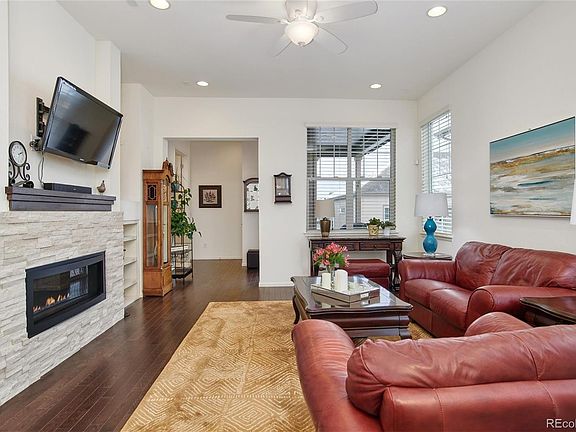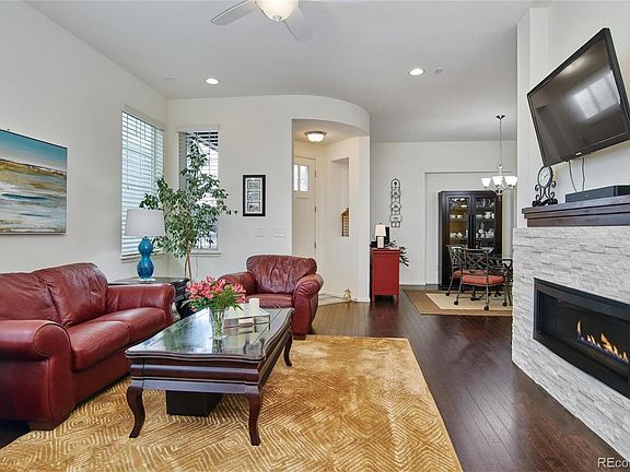 Ranch style home with a luxurious kitchen and upgrades throughout including stainless steel appliances, gas range with center grill, large island for stools, slab granite & quartz countertops, upgraded cabinets opening into the breakfast nook and living room areas with a gorgeous gas fireplace stone surround. Master bedroom has a dual sink vanity, 2 closets, walk thru to the laundry room and into the kitchen. Basement is very open with a large main area, larger bedroom & walk-in closet, full bath, and 2 storage areas. Newer built, shared patio home with a NO MAINTENANCE YARD, fire rated and sound proof walls on a very quiet lot. HOA maintains the yard including cutting the grass, fertilizing, trimming trees/bushes, watering, snow removal on sidewalks and steps, and exterior building insurance coverage. Property is walking distance to a park with wonderful mountain views. Other upgrades include hardwood floors, 10' ceilings, matching ceiling fans, central A/C, 50 gal water heater, new roof installed 2/2021. Close to the outlet stores, parks, hiking and biking trails, hospital, downtown Castle Rock, DTC, and Park Meadows mall.