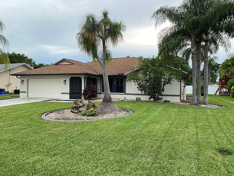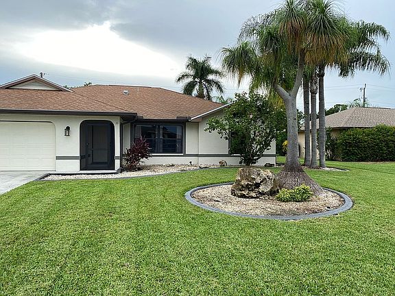 Single Family Home for sale by owner in Cape Coral, FL 33904. ** Buyer Agent Protection ** Beautiful POOL home in a great solid-family neighborhood, close to everything and 1 mile North of Cape Coral's new Sidewalk District. Home has 18" tiles throughout with new carpet in the bedrooms, and upgraded 5" baseboards in main living areas. Cathedral ceilings in main living areas as well as the Master Bedroom and ceiling fans throughout. Generous walk-in closet in Master. New paint throughout. New commercial grade water heater installed April 2019, Reverse Osmosis drinking water and water softener are a just a few of the extras. Large Lanai overlooking a Gorgeous POOL and HOT TUB with cage. Brand New concrete curbing was just installed around the entire home in July 2020. All overgrown vegetation has been removed and is ready for your own personal planting touch. NEW white vinyl privacy fence installed Jan 2019 in back of property, and can easily be extended to side yard as needed. Custom made clear hurricane panels for all windows. Brand NEW front lanai screen cage installed in May 2020. City water and sewer with IRRIGATION SYSTEM to keep your lawn looking nice all year long. This home won't last long at this price. Zip code lowest crime rate in county.