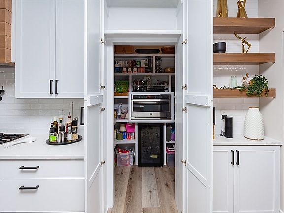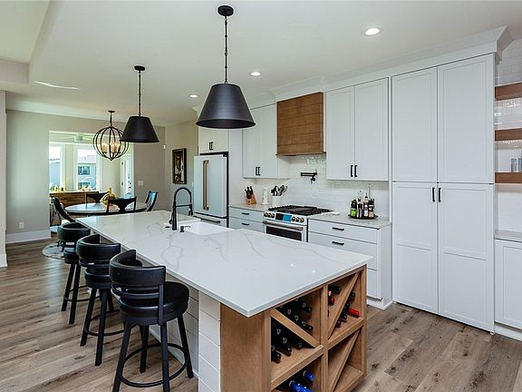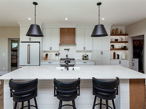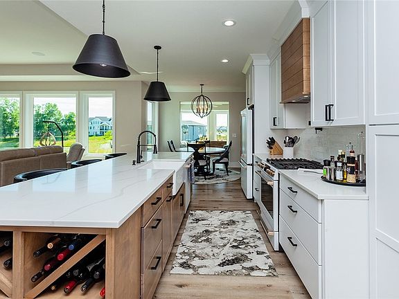 Better than new sprawling ranch in Clive's Shadow Creek neighborhood! This home has it all - large living room with open concept eat-in kitchen, Sonos speakers, GE Cafe Appliances, coffee bar, soft-close cabinetry and convection microwave and wine fridge in hidden pantry with upgraded shelving. Sun room, dining room, laundry, half bath, full bath, two bedrooms all on the main floor. Primary suite has a large 10 ft slider to partially covered, dual shower heads and heated flooring in bathroom, large walk-in closets with all upgraded shelving. Lower level features 4th bedroom with full bath, 5th bedroom with en-suite full bath, and 6th non-conforming room. LVP throughout main areas in lower level and bar with full fridge and dishwasher. John Deere garage/room with spigot, irrigation, pond views, composite decking, extensive landscaping including built-in fire pit! All information obtained from seller and public records.