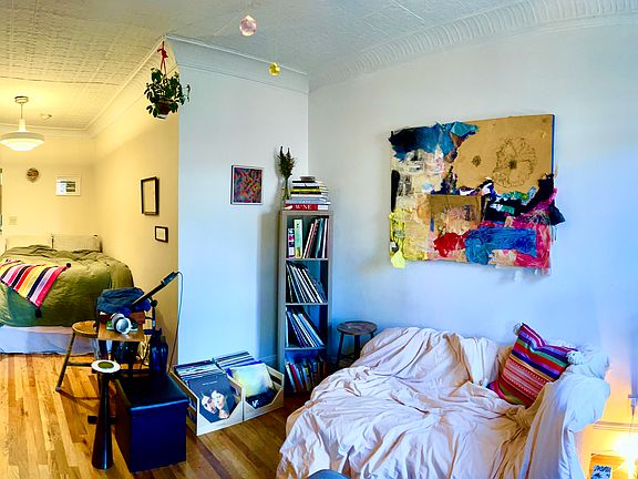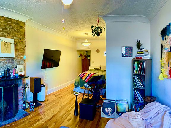Large 3-room studio with completely separated kitchen, sleeping alcove and working fireplace. Located in a famous commercial corridor known as Boutiques Row. On the 3rd floor in a walk-up. Only 4 units over a dress shop. A few period details: exposed bricks, tin clad high ceilings, oak floors and a fully operational wood-burning fireplace! One huge closet at the foyer entrance and overhead storage for suit cases. Kitchen has some cupboards & brand new stove. No laundry in the unit or building but plenty of facilities in the neighborhood that pick up! Cats are OK. Best used by single person. Heat and hot water included in the rent. Broker's fee is only one month's rent. No floor plans or video available.