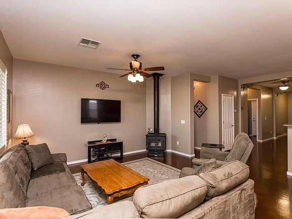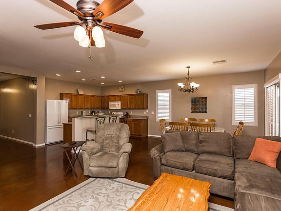 Picture perfect and Move in Ready! This wonderful home located in Highlands Ranch has so much to offer! Great open floor plan with 9 ft ceilings. Spacious foyer leading to the kitchen with island and family room with cozy freestanding wood stove. Beautiful plantation shutters. Fantastic stained concrete floors. The on-suite master bath is complete with a large walk in shower, garden tub, dual sinks and a spacious walk in closet. Inside laundry room. Covered patio to enjoy our plentiful sun filled days. Pretty shady backyard with block wall fencing and shed. 2 car extended attached garage with insulated garage door. Ceiling fans in all the rooms. Reverse osmosis system. Whole house fan. Large corner lot with double gate to side yard. So much more. Don't miss out.