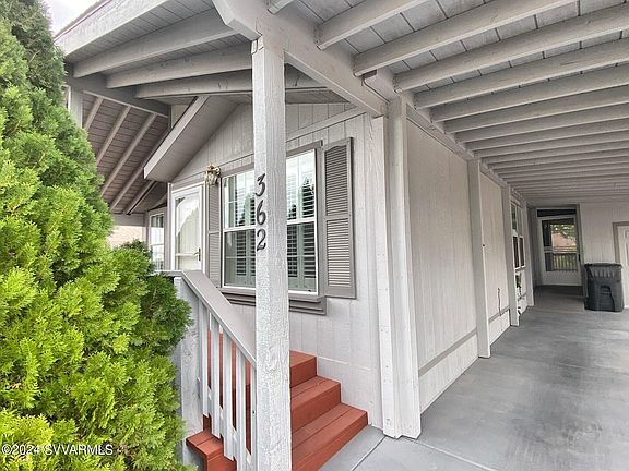 Clean, quiet, and comfortable cottage setting. This charming 2 bedroom, 2 bath manufactured home is located in the highly desirable Pine Shadows 55+ gated community. Conveniently located with views of the mountains that surround the Verde Valley. This home is just a few miles from local grocery stores, Old Town Cottonwood, Clarkdale & the historic town of Jerome. Featuring a very spacious screened in back patio for year-round use. Great place to sit and watch the hummingbirds. Freshly painted inside and out with new carpet, storage room, and 2 car carport. This home is move in ready with nothing to do but relax and enjoy. Community has a pool, hot tub, pickle ball courts, horseshoe pits, BBQ area, exercise facility, & club house. Located on a beautiful public golf course.