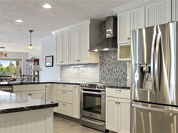 Completely remodeled in 2021. All new custom cabinets throughout, new laminated wood flooring throughout, quartzite countertops in kitchen and master bath, raised ceilings, covered outdoor kitchen and bar, sub zero refrigerator/freezer and wine column in the kitchen, hurricane sliding doors and large picture windows looking out at the water, screened in patio off the master bedroom, walk in master closet, walk in pantry, 12’ ‘ wet bar with custom wood countertop and coffee cubby, pool, travertine patio that spands the entire back of the house, gas Italian double over and range, gas grille, tankless gas water heater, and so much more ! Only the first 2 pictures on the listing are current.
