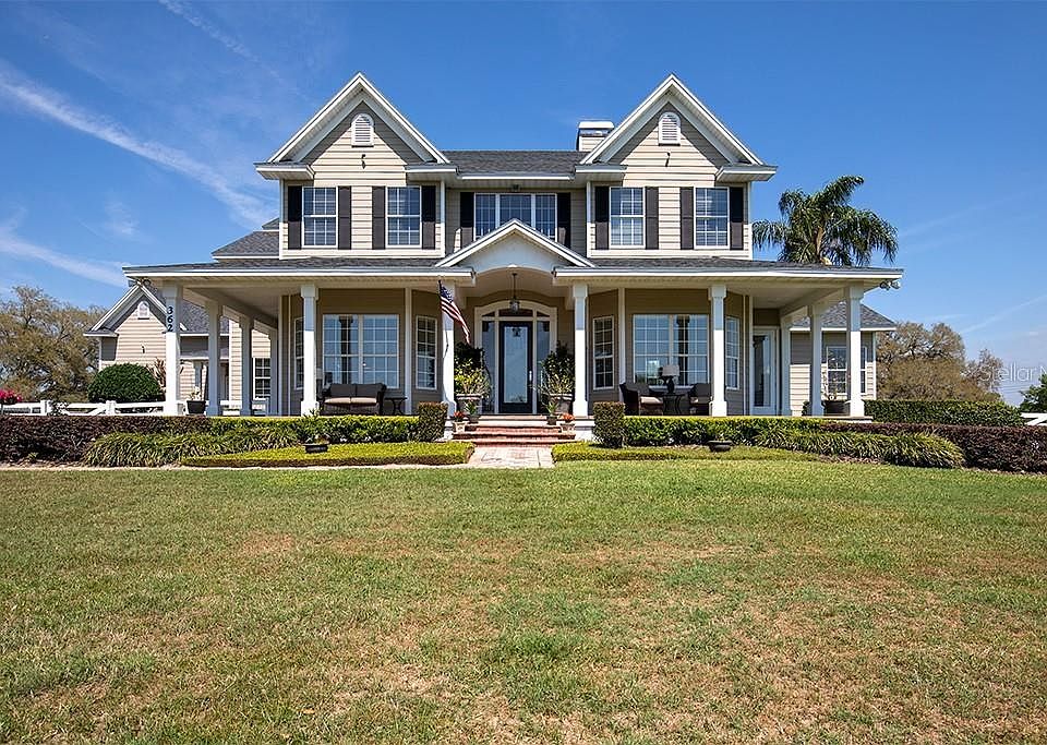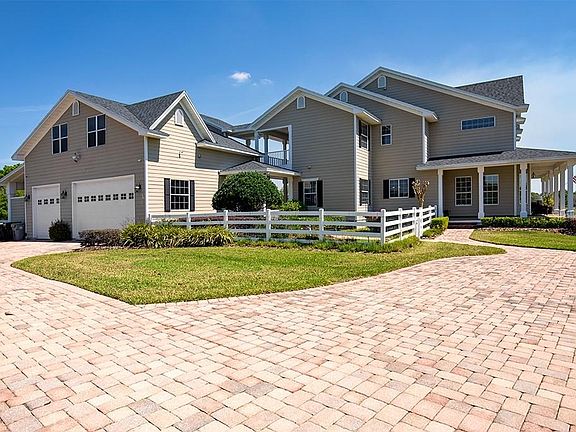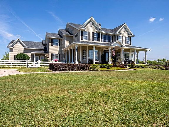 Stunning 5/4.5 fully fenced in estate home on 3.45 acres is located in Bluegrass Estates! Bluegrass estates is a close-knit equestriancommunity featuring 52 homes located within 20 miles from Downtown Orlando and 29 miles from the Disney Parks! Thecommunity features a gated entrance, a 3 mile riding trail and a 30 acre shared pasture. This home features a private gatedentrance with a brick paver drive showcasing the grand entrance of the home. Upon entering, you will notice that every detail hasbeen accounted for. Wood flooring throughout with an open and cozy layout with vast views of the gorgeous estate. Interior finishesinclude custom chandeliers, crown molding, built in features, security cameras throughout, gas fireplace upstairs and downstairs, wet bar,exterior balcony, summer kitchen, detached in law/flex room above the garage, new roof, 3 brand new AC units, two laundry rooms,outdoor shower with brick paver in-ground chlorine pool and spa, 3 car garage, and much more! The master bedroom is locateddownstairs, with four additional bedrooms upstairs. Three bedrooms upstairs offer private baths. Large bonus/flex room upstairs hasa pool table and stand alone bar that will be conveyed with the sale of the home. Bring your horses! This home has it all and is aspecial custom home for the pickiest of buyers!