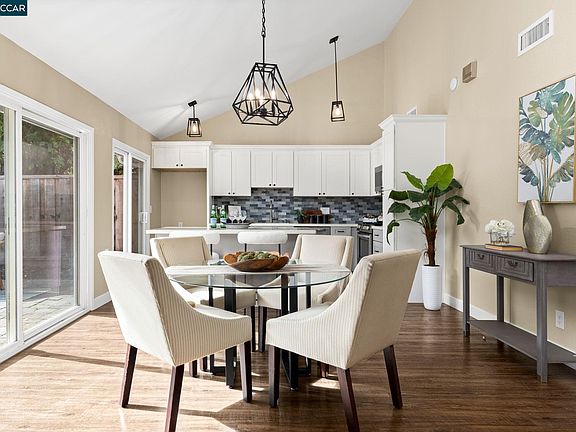 Beautifully remodeled and ideally situated, this Meadowood home combines refined design with comfortable single-level living. The open-concept great room is the heart of the home, featuring vaulted ceilings, a gas fireplace with tile surround, recessed lighting, dual sliders to the backyard, and wide-plank luxury vinyl flooring that extends throughout. The remodeled kitchen showcases white shaker cabinetry with soft-close drawers, quartz countertops, a full-height tile backsplash, stainless-steel appliances, a gas range, and a contrasting gray island with bar seating. The spacious primary suite offers a private retreat with direct yard access, a walk-in closet, and an ensuite bath with a dual vanity, quartz counters. Two additional bedrooms share a remodeled hall bath. Step outside to a private backyard with a paved patio, lush faux lawn, and mature shade trees, ideal for relaxing or entertaining. A paver driveway enhances the home’s curb appeal, and the location offers unbeatable convenience just steps from the community pool. Served by top-rated San Ramon Valley schools and close to parks, shopping, dining, City Center Bishop Ranch, and major commuter routes.