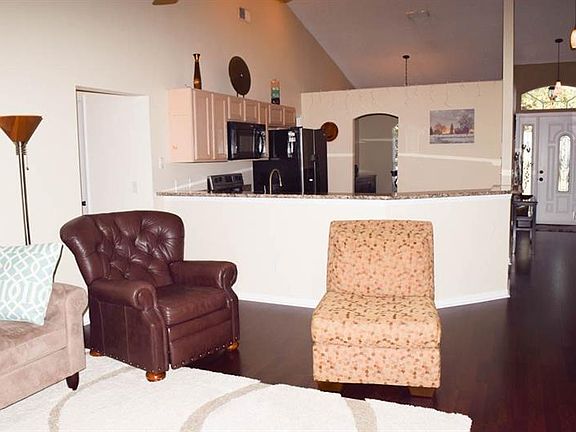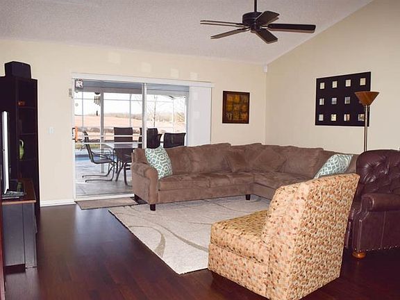 This move-in ready home shows like a model and has three bedrooms and two full baths. Many upgrades completed in the past two years including high grade wood look laminate in all living areas, granite countertops in the kitchen and both bathrooms, new water heater, new pool filter, rain gutters and a beautiful lead glass front door. The AC was replaced in 2011 and the roof in 2009. The kitchen is open to the family room and is large enough to accommodate a table. There is a separate dining room as well as a separate living room, the perfect flex space to use as an office, playroom or even a living room! The master bedroom can accommodate a large bedroom set and the bathroom features double sinks, a garden tub and a walk in shower. The guest bedrooms are on the other side of the house and share a bathroom which has access to the patio. The backyard is a great place to entertain with a large covered patio and screened pool.