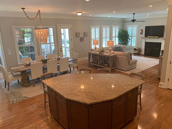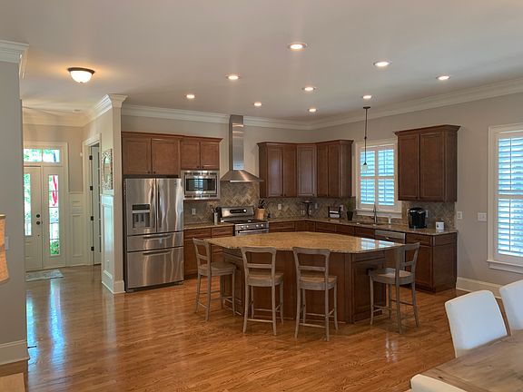 - RoomKitchenFeatures: Granite Counters, Kitchen Island, Recessed Lighting, Eat-in Kitchen, Floors-Hardwood, Cabinets-Stained, Backsplash-Tiled