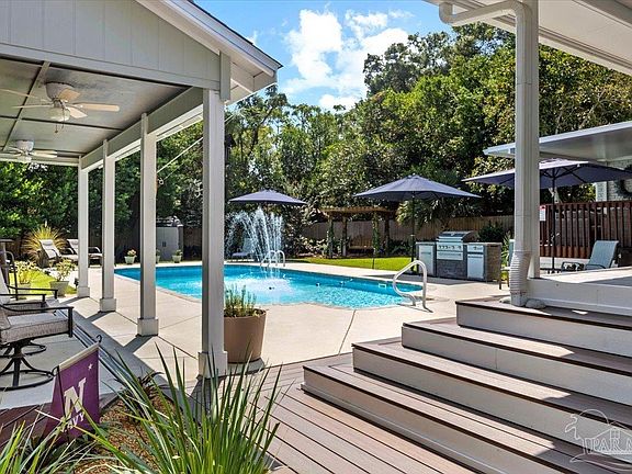 Sparkling saltwater poolQuartz countertopsHardwood floorsHurricane impact windowsExpansive covered trex deck