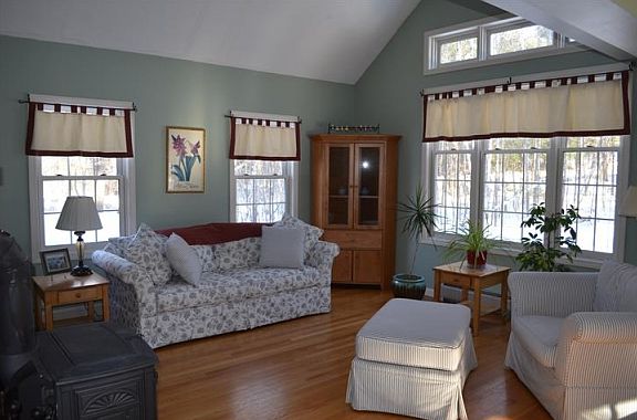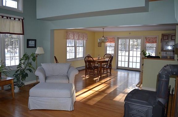 Welcome home to this Cape style home with delightful contemporary design flourishes, and within walking distance to Hopkinton village. Light and bright and open is the theme. The living room ceiling is cathedral height and has a skylight. The focal point of this room is a cozy woodstove (with its own wood elevator from the lower level!).The kitchen, with a breakfast bar, opens to the dining area and large deck with an awning. The family room is a wonderful place to unwind & is spacious enough to be a 3rd bedroom if needed. Convenient to this room is a full first floor bath and a laundry. The 2nd floor, with an overlook to the living rm, a fun design feature, has two good sized bedrooms with plenty of closet space, and a 2nd full bath. The backyard is open, private and wooded and is enhanced with many established gardens.