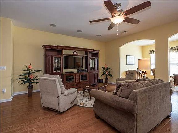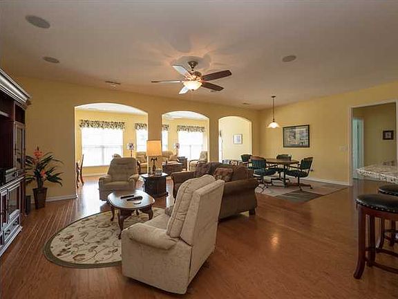 This Del Webb Charleston spectacular Morningside model is this neighborhoods largest floor plan with 3 bedrooms and 3.5 baths and is being offered at the gated 55+ active adult community of Del Webb at Cane Bay. Entering the front door, you will notice the gleaming oak hardwoods throughout the whole house with exquisite molding. Inviting foyer area leads to living room area on left and dining room on right with tray ceiling and butler pantry area. The huge kitchen with center island is an upgraded chef's dream. Beautiful cabinetry with subway tiled backsplash, stainless steel GE Profile appliances including smooth cook top, wall convection oven and convection microwave, granite countertops with breakfast bar, lots of recessed lighting, 18''x18'' tile flooring and enormous pantry roomts of shelving. Great room is flexible for furniture placement and flows into the eat-in area for the kitchen. Sunroom overlooking the lagoon has a cool breezy ceiling fan and is the most relaxing place during the day. All 3 bedroom floors are also covered with wood (no carpeting in house). Inviting master bedroom has tray ceiling and 52'' ceiling fan which opens into the expansive bathroom with elongated soaking tub, separate sit-in shower and waist high double vanity countertops. Master bedroom closet will have you organized with its huge wardrobe area. On the other side of the house, you will find 2 large bedrooms each with its own bathroom. Between these 2 bedrooms is the laundry room utility sink and granite counter top cabinets. Off the back of the sunroom in the rear is an enlarged entertaining vinyl fenced-in porch area with retractable awning and natural gas line for grilling which looks over that wonderful lagoon and fountain. Extended garage has pull down stairs for floored attic access plus energy saving Tech Shield in attic. All window treatments stay. All furniture negotiable. Did I tell you that the seller is offering you a 1 year AHS home warranty? If you want a home that will impress, take a step inside and be WOWED!! The 55+ community of Del Webb at Cane Bay amenities at The Resort include a Recreation and Social Center. Complete with a state-of-the art workout facility, aerobics studio, heated indoor pool and hot tub, men's and women's locker rooms, a social lounge and multi-purpose space to accommodate the varied interest groups. In addition to the indoor amenities, homeowners will enjoy miles of walking trails, tennis courts, pickle ball courts, bocce courts, a heated outdoor pool and hot tub, a sun deck and the beauty of preserved wetlands and peaceful open space.